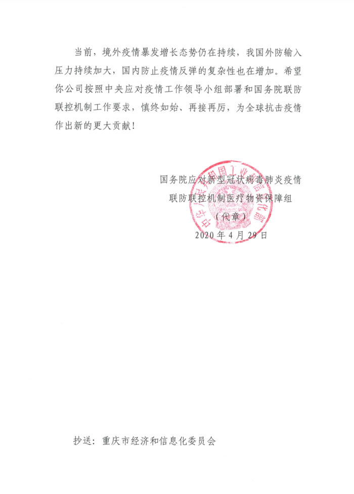 国务院应对新型冠状病毒肺炎疫情联防联控机制医疗物资保障组发来感谢信