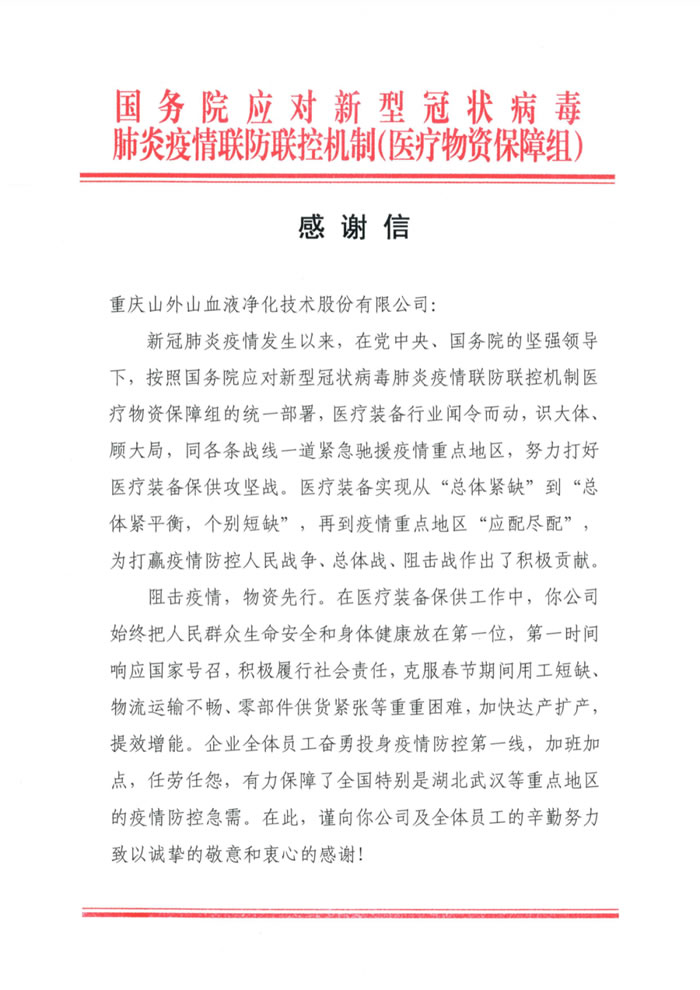 “谨向你公司及全体员工的辛勤努力致以诚挚的敬意及和衷心的感谢!希望你公司慎终如始,再接再厉、为全球抗击疫情作出新的更大贡献!”国务院的感谢信让每一位山外山人都深受鼓舞和感动。今后,山外山将不负重托,不负韶华,持续奋斗,为疫情防控取得全面胜利做出更多贡献,为中国血液净化行业奉献山外山力量!
