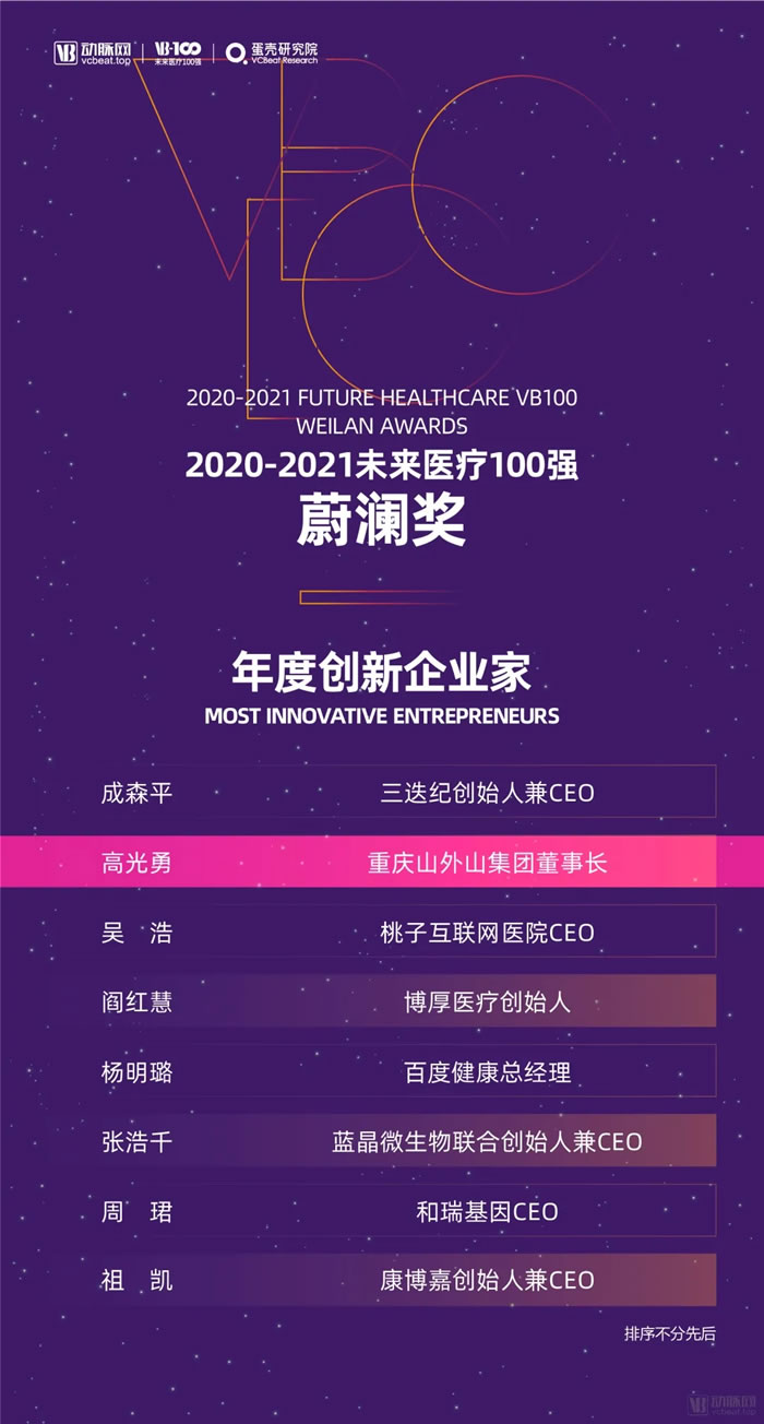 此外,山外山公司创始人兼董事长高光勇凭借持续创新求变的发展理念,获得“2020-2021未来医疗100强·蔚澜奖·年度创新企业家”荣誉。捷报连连,再次体现了山外山公司在医疗器械产业的前瞻探索和卓越创新获得业界认可。
