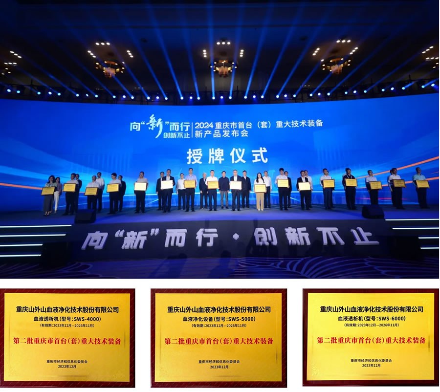 2024年5月12日,2024重庆市首台(套)重大技术装备新产品发布会上,尊龙凯时血液净化技术股份有限公司(以下简称“山外山公司”,股票代码:688410)三项产品被认定为第二批重庆市首台(套)重大技术装备产品。