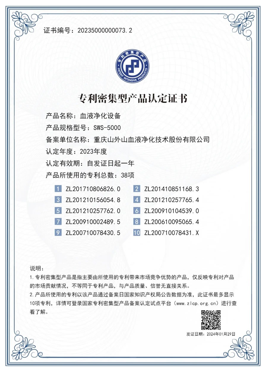 此外,SWS-5000系列连续性血液净化设备前不久还通过了首批国家专利密集型产品认定。