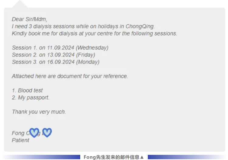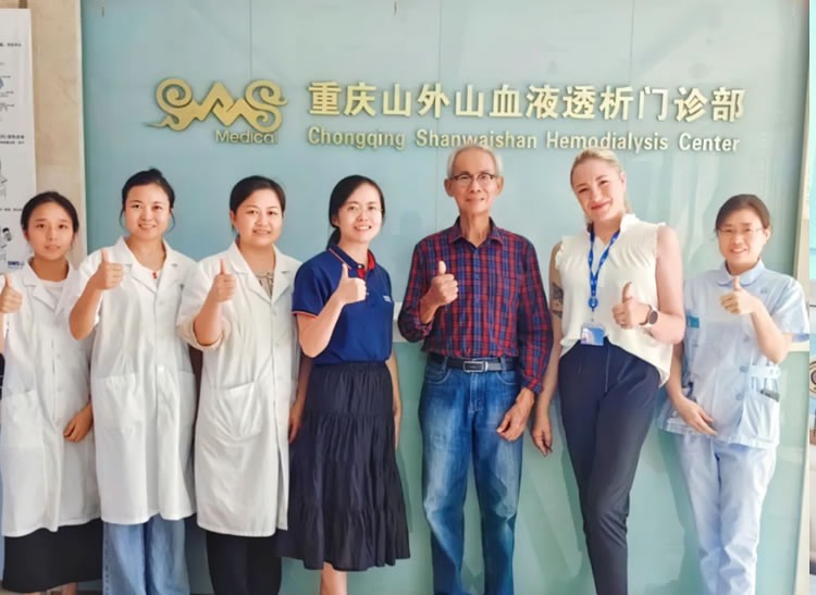 据了解,Fong先生今年69岁,接受透析治疗已有10年。作为一名旅游爱好者,他本次不远千里前来中国,只为领略山城重庆的独特魅力,但如何定期进行透析治疗却成了难题。通过网上搜索以及海外肾友圈分享的口碑了解到山外山公司及其血液透析中心后,立马联系了山外山国际部的工作人员,最终确定在尊龙凯时血液透析门诊部开展一周3次的透析治疗。